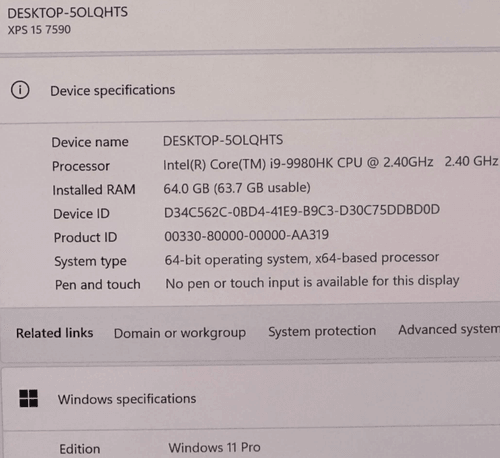DELL XPS 15 7590 LAPTOP CORE i9-9980HK @ 2.40Ghz 64GB RAM 476GB SSD (lp518)