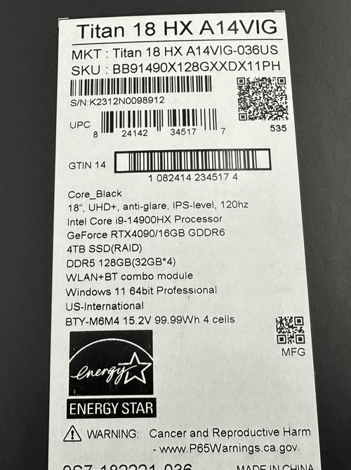 Titan 18 HX A14VIG Gaming Laptop Core i9 14th Gen 4TB SSD RTX 4090 Graphics